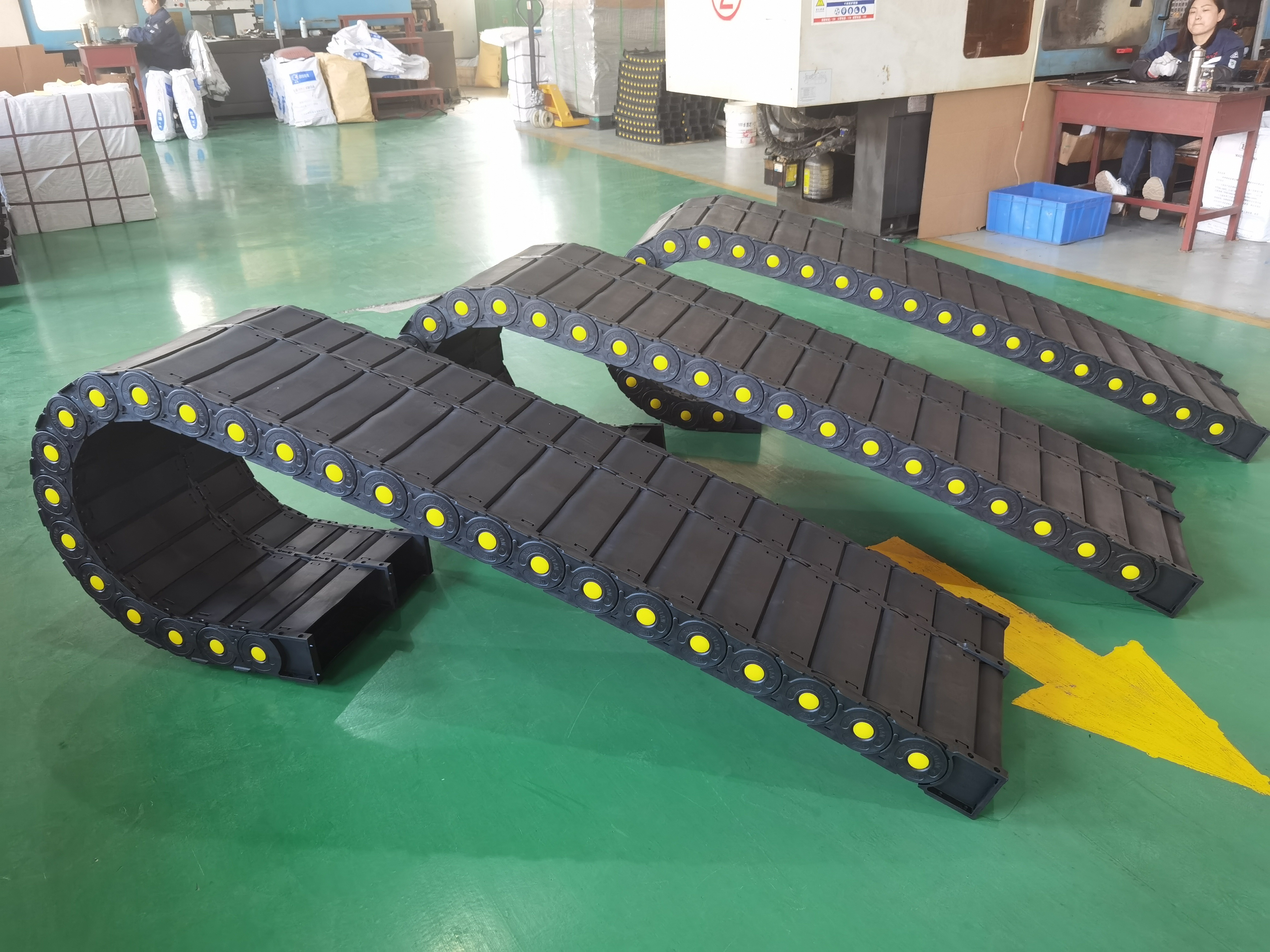 拖链的每一个单元链节均可轻松打开,便于安装和拆卸,无需穿线。内部空间可根据需求通过分隔片灵活分隔,方便放置电缆、油管、气管等。此外,拖链的内高、外高和节距相同,而内高和弯曲半径R有多种选择,以满足不同客户的需求。